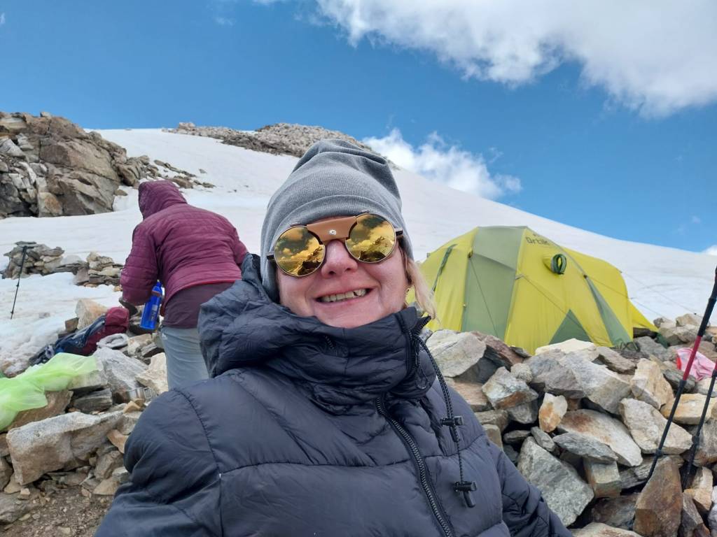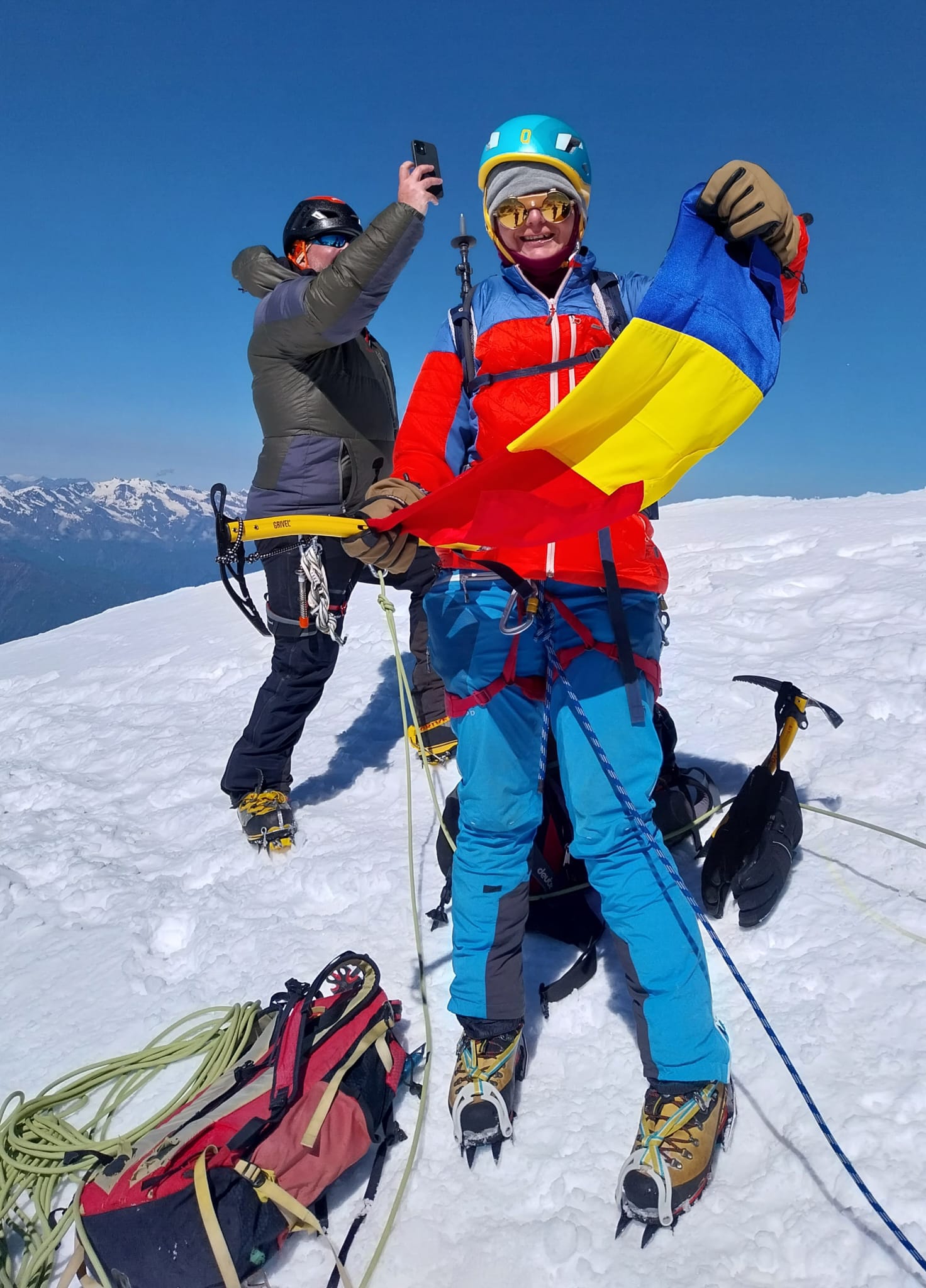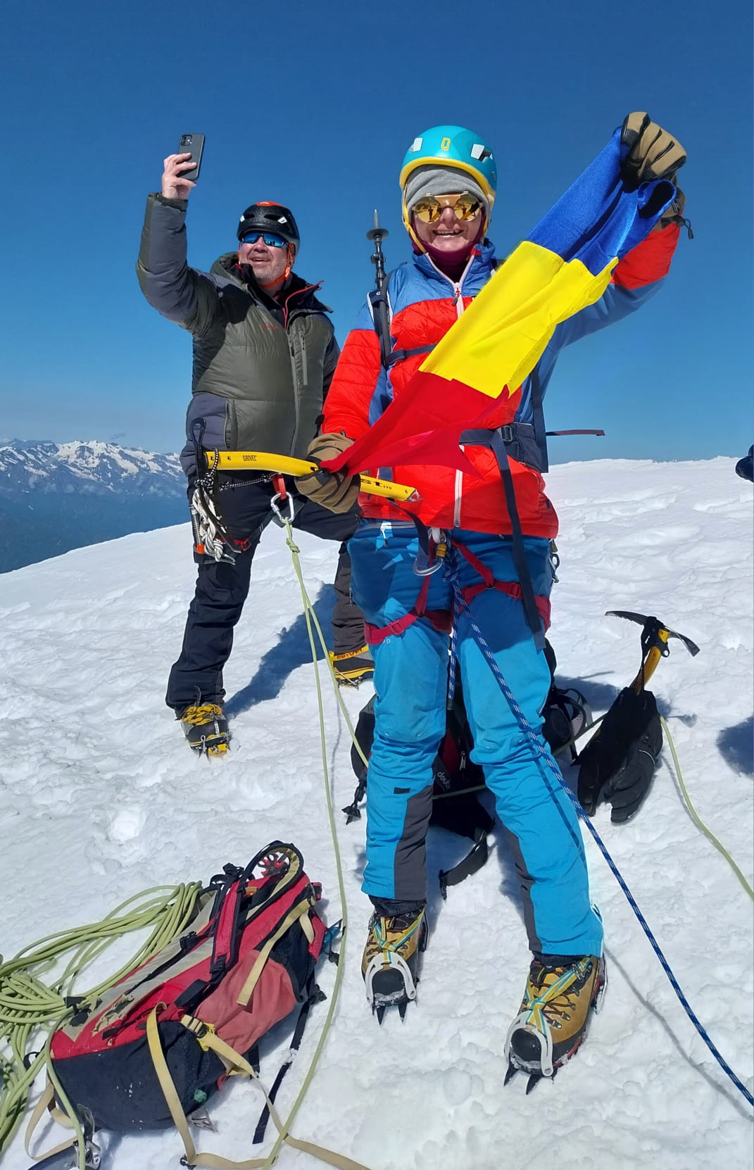 Vârful era tot mai aproape: 4700 m, 4800 m… Hai ca mai aveam puțin. Totul era să mai am putere și pentru intoarcere. Știam că la coborâre era mult mai greu. Continuam să urc, mă mai opream să imi umplu sufletul cu frumusețea din jur și să imi mai reglez respirația. Eram acum impreună, toți cei patru români și cu Archil. Vârful era tot mai aproape, 50, 30, 20m hai, incă 10 m. Atunci colegii de drum mi-au făcut o surpriză. Mi-au spus să calc eu prima pe vârf. Știau cât mi-am dorit să ajung pe vârf și că pentru mine, la vârsta mea, era o mare realizare. A fost momentul in care mi-au dat lacrimile. Am parcurs cu greu ultimii metri, iar cand am ajuns pe varf am izbucnit in plans. De fapt, era un amestec de plans și ras, eram fericită și parcă nu imi venea să cred.