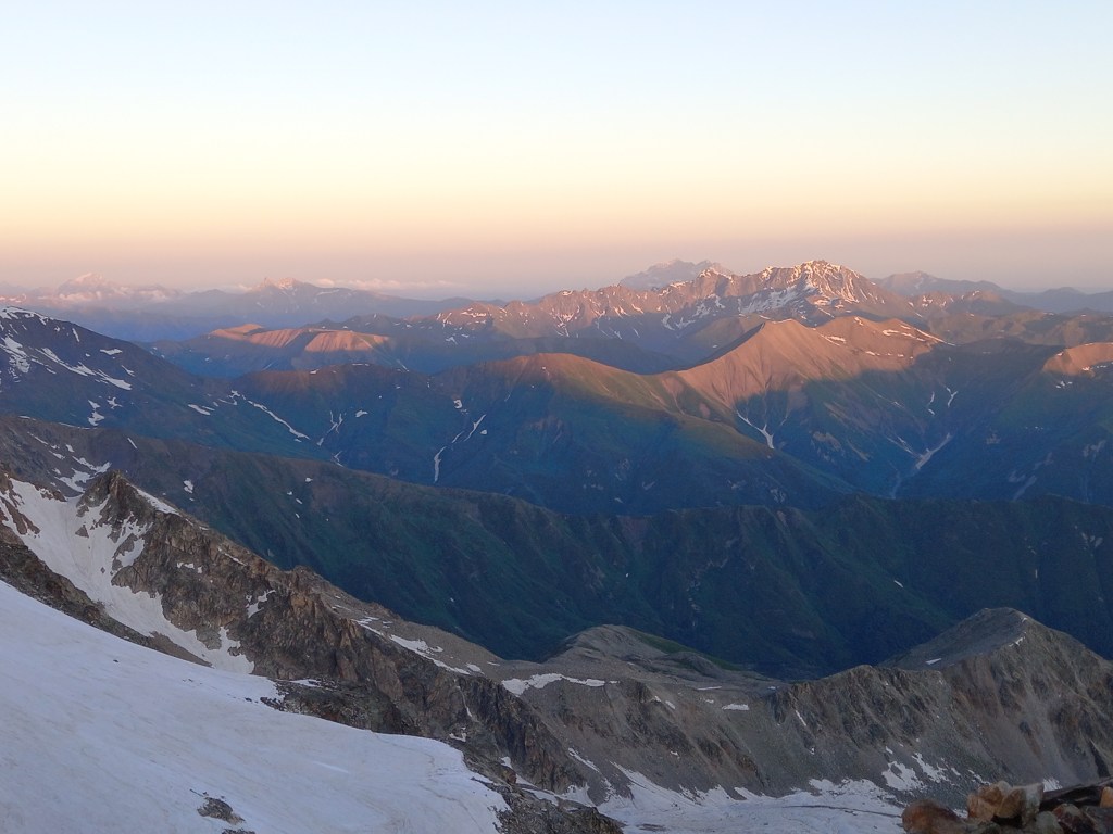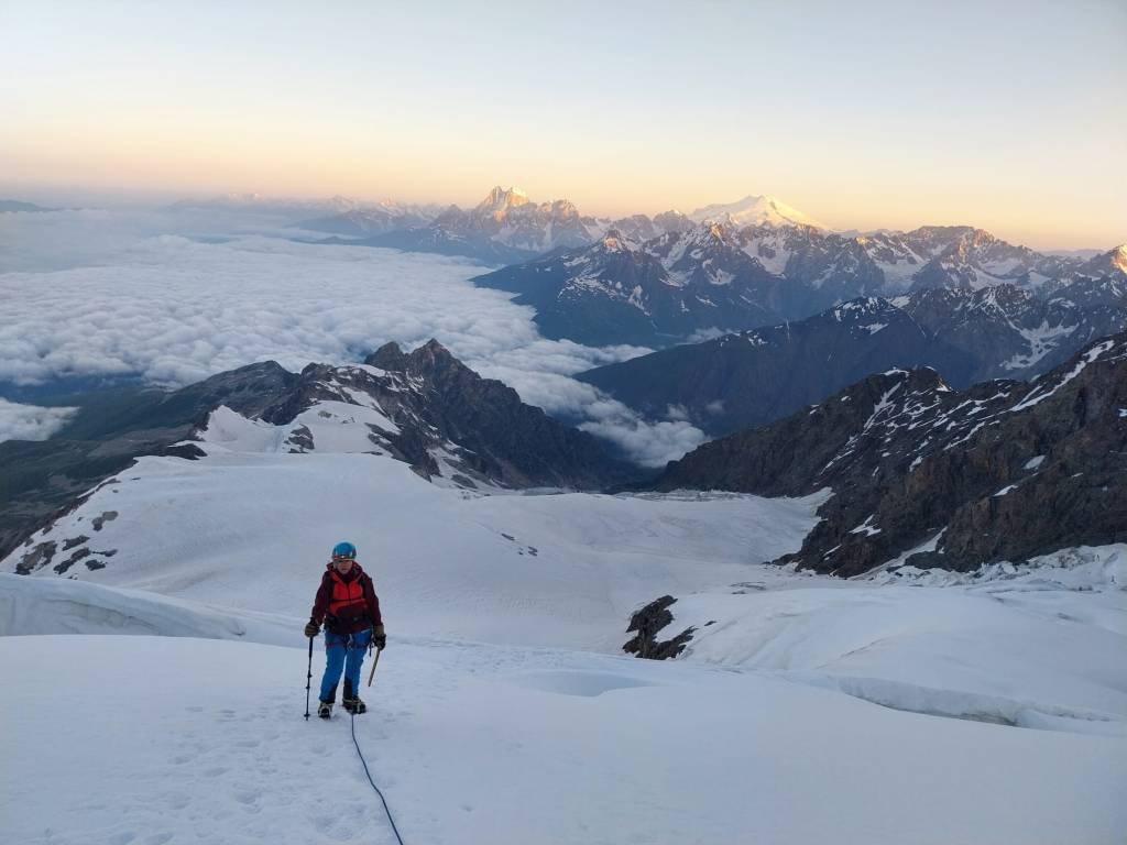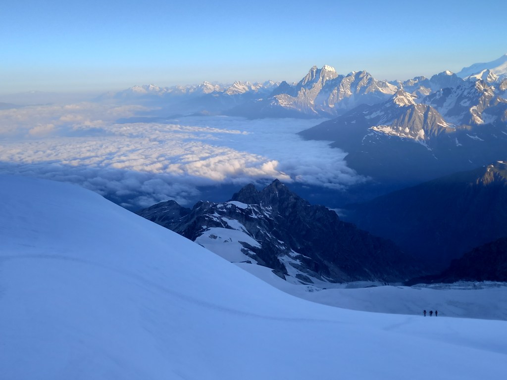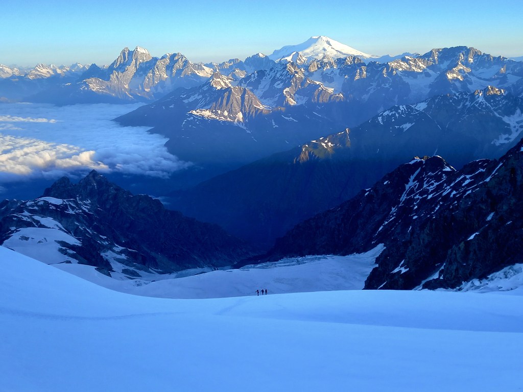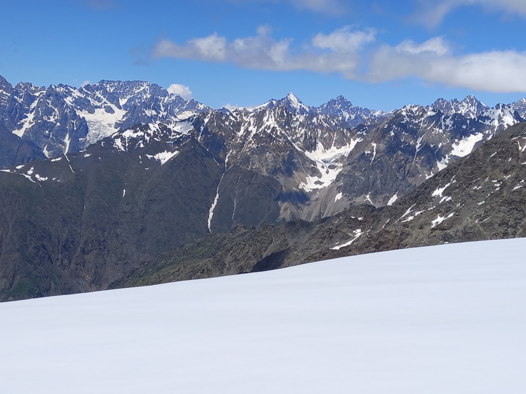 Am ajuns intr-o șa, la 4200 m. Urma o cățărare pe o porțiune stâncoasă, cu pietre instabile și sfărâmicioase. Dar peisajul era de vis. Soarele răsărise, eram deasupra unui ocean de nori. Varful Elbrus, Ushba și alte culmi inzăpezite ale Caucazului se ridicau in soare. E greu de spus in cuvinte ce am simțit atunci, cât de frumos era totul. Din păcate nu puteam să stăm prea mult, opririle erau scurte, nu trebuia să ne ia frigul sau să ne ieșim din ritm. Aveam noroc, vremea era excelentă.