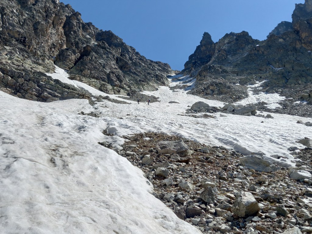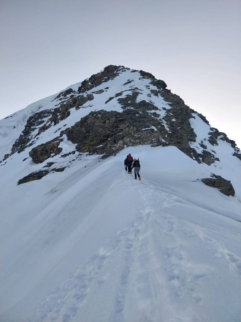 Am reușit să trec de acea parte de cățărare, după care a urmat o porțiune de urcuș cu zăpadă inghețată. Il vedeam inainte pe Archil cum săpa cu pioletul trepte in gheață, și așa știam ce mă așteaptă. Sincer, nici nu am realizat când am urcat și pe acolo, Doar m-am oprit să imi trag sufletul, in momentul in care am intalnit un loc mai plat. Urma o porțiune de creastă foarte ingustă și expusă, Erau porțiuni late cam de 15 cm, cu prăpăstii adânci de o parte și de alta. De obicei, când traversez astfel de porțiuni mă uit doar unde pun piciorul, nu privesc nici in stanga nici in dreapta, nu vreau să știu cât de mult e până jos. Acum insă, am realizat cât de ingustă e creasta și ce expusă este abia la intoarcere. Eram prea concentrată, cu adrenalina la maxim, totul era prea frumos, așa că am mers fără emoții pe această porțiune.