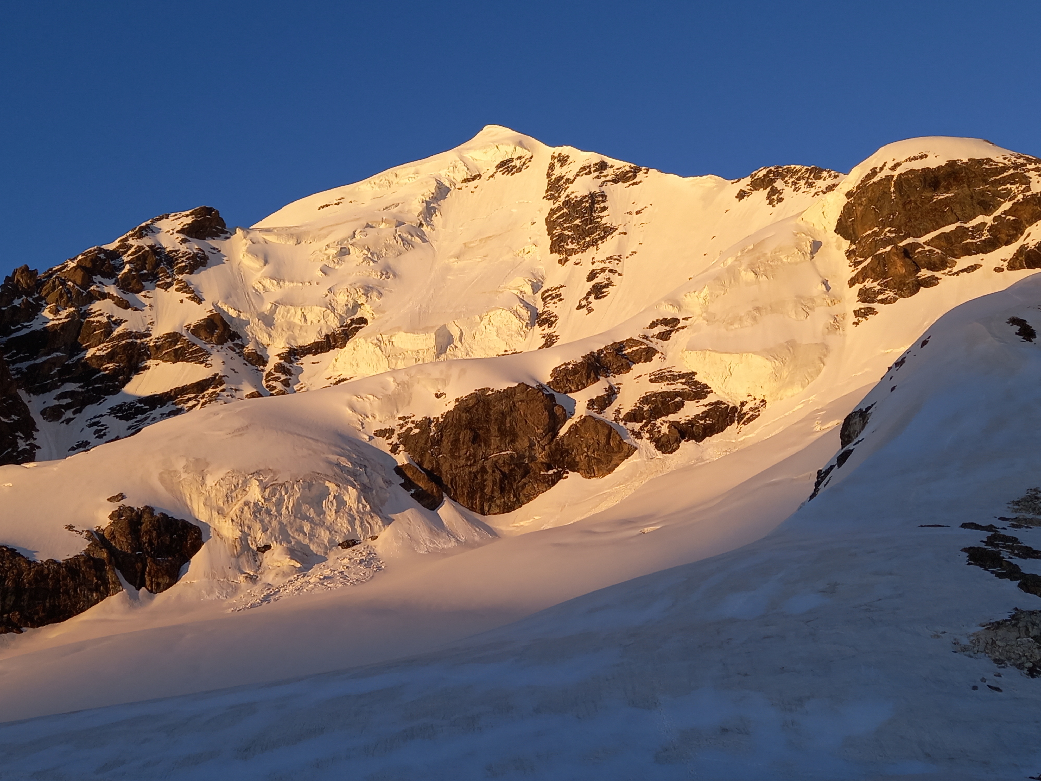 La inceput traseul pornește pe o curbă de nivel, unde se merge ușor, după care incepe un urcuș foarte accentuat. Zăpada era inghețată, motiv pentru care s-a format coadă la urcarea pe această porțiune. După un urcuș accentuat de vreo 100 m, a urmat o porțiune mai ușoară. Mergeam după georgieni care insă urcau foarte incet. Marian mi-a zis să incercăm să ii depășim, numai că pentru asta a trebuit să măresc mult ritmul. După ce i-am depășit a trebuit să ne oprim, să imi reglez respirația. Ne-au luat-o iar inainte, dar mergeau mult mai incet decât noi. Până la urmă s-au oprit și i-am depășit, lăsându-i mult in urmă. Mergeam pe ghețar, așa că au apărut crevasele. Am trecut peste una mare, care mi-a dat emoții. Când eram pe la 4100 m a inceput să se ivească zorile. Am depășit și echipa din Ungaria și i-am ajuns din urmă pe prietenii noștri. De acum eram convinsă că voi ajunge pe varf. Era greu, mă mai opream, respiram cu greutate, dar mergeam totuși bine, in ritm cu ceilalți.